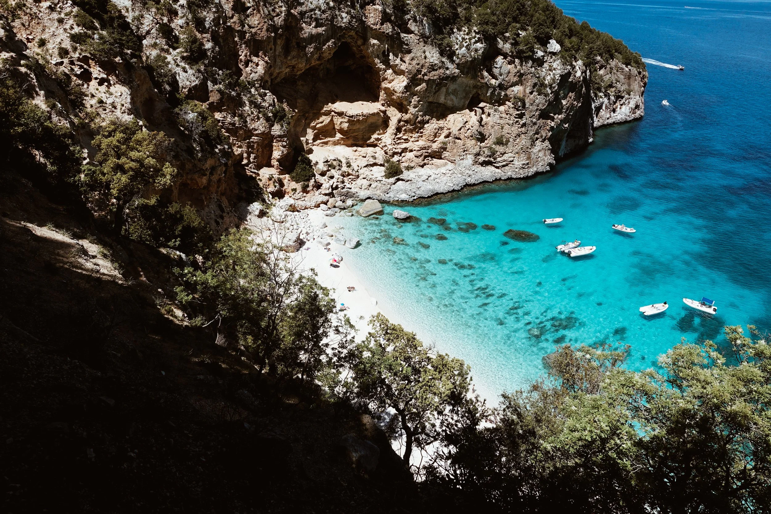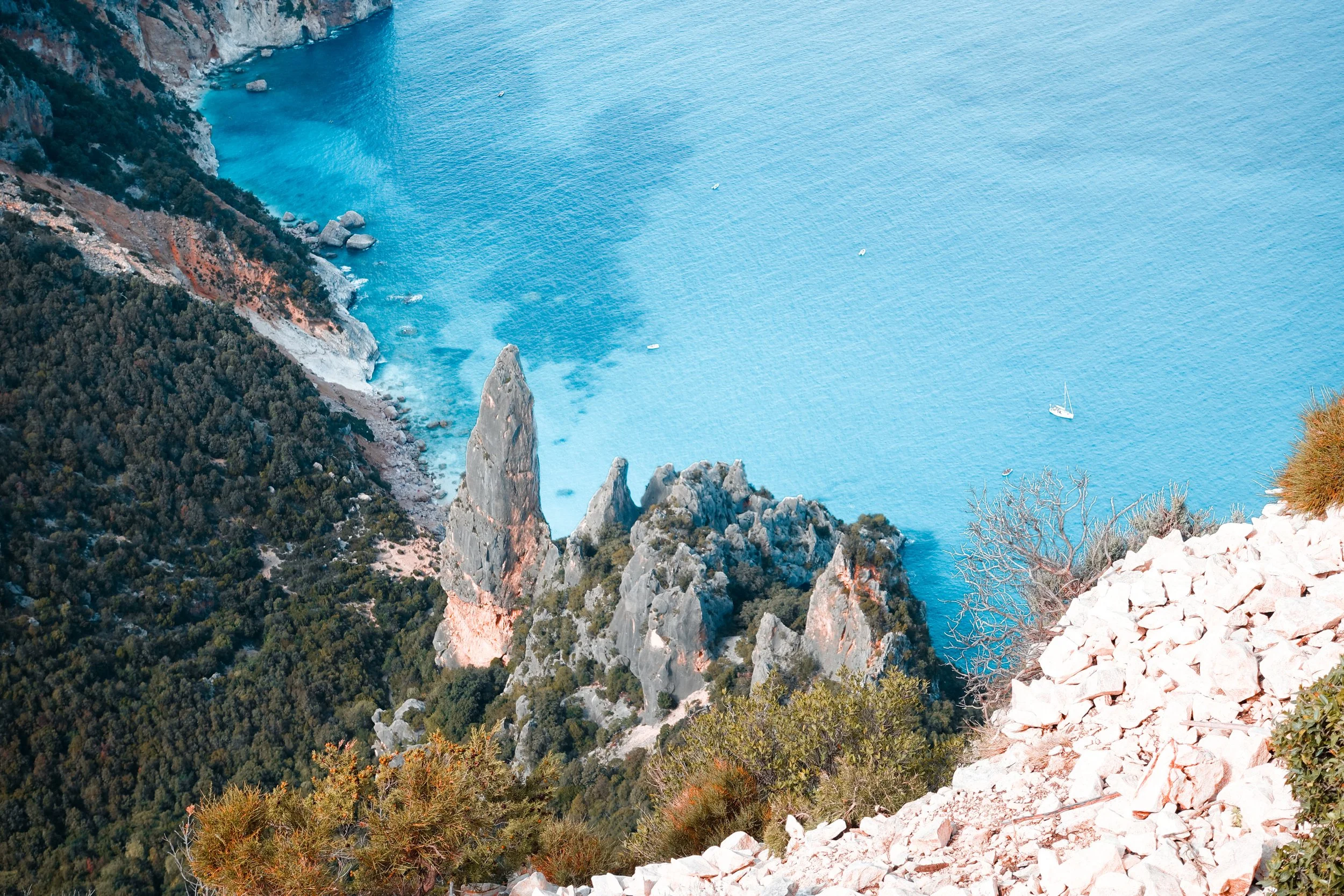 The grand finale comes by sea. From Cala Sisine we return to Santa Maria Navarrese by boat, navigating south along the entire Selvaggio Blu coastline. Seeing the cliffs, coves and ledges from the water gives a completely new perspective on the terrain we have just crossed on foot, bringing this wild Mediterranean adventure full circle.